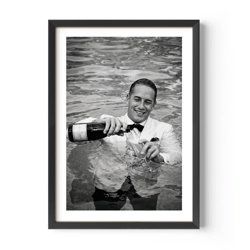 This print just gets it. A waiter skiing off a rooftop with champagne, a guy in a white tuxedo pouring below, a woman in fur not even flinching. Pure alpine glamour and it works perfectly on the wall.