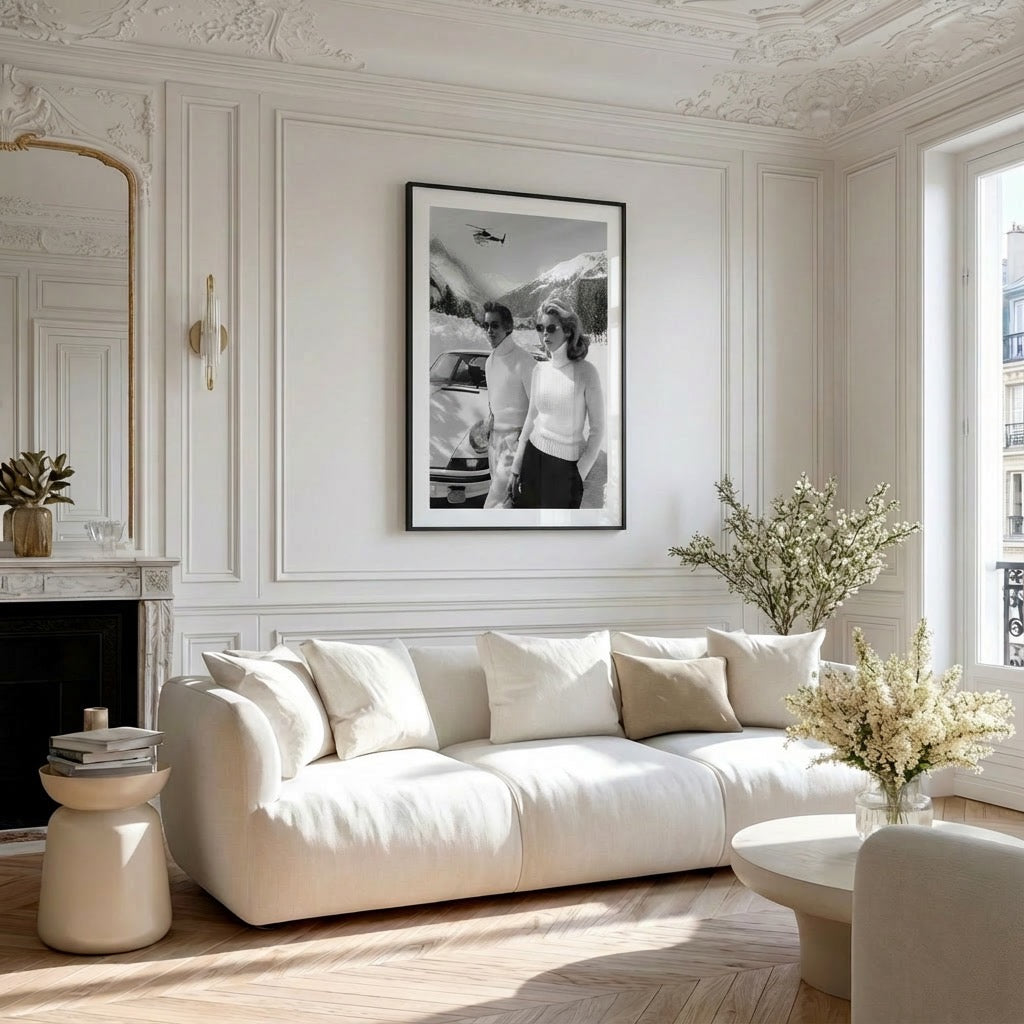 Our Alpine Escape Poster captures the essence of timeless alpine elegance. The artwork portrays a stylish couple dressed in classic knitwear, standing beside a vintage Porsche in a luxurious ski resort setting. Behind them, snow-covered peaks rise toward the sky as a helicopter ascends above the valley — a symbol of sophistication, freedom, and effortless style. Presented in black and white, the composition highlights texture, contrast, and the serene confidence of 1980s winter glamour.