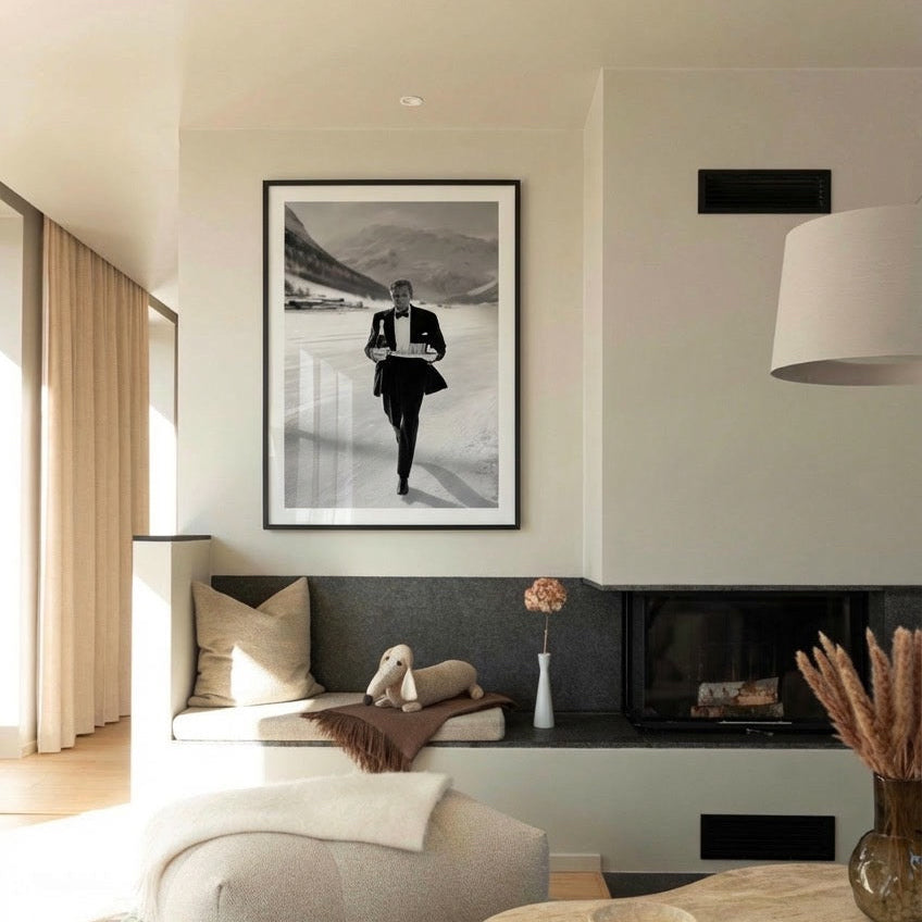 Add a touch of timeless sophistication to your walls with the Waiter in Gstaad poster. This striking black and white artwork captures the elegance of a tuxedo-clad waiter walking confidently across a snowy alpine landscape, carrying a tray with champagne and glasses. Set against the dramatic backdrop of the Swiss mountains, the scene reflects both the glamour and exclusivity of Gstaad—one of the world’s most renowned luxury destinations.
