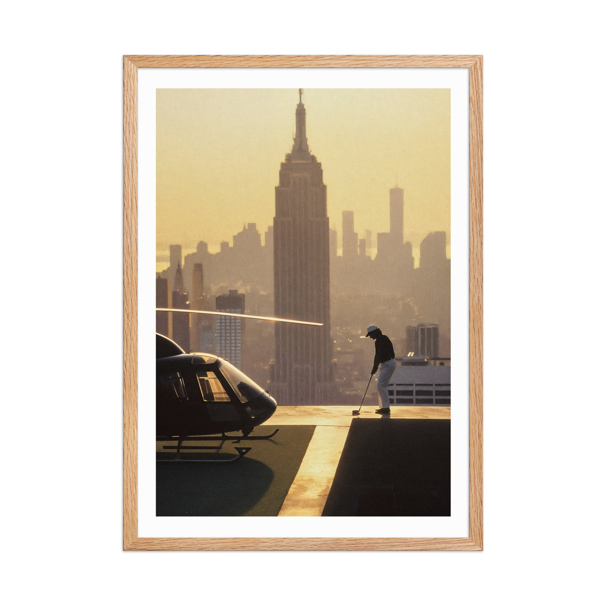 Swinging Above Manhattan Poster captures a moment reserved for the select few: the city still half-asleep, the skyline washed in gold, and a lone golfer practicing his stroke on a private helipad high above Manhattan.