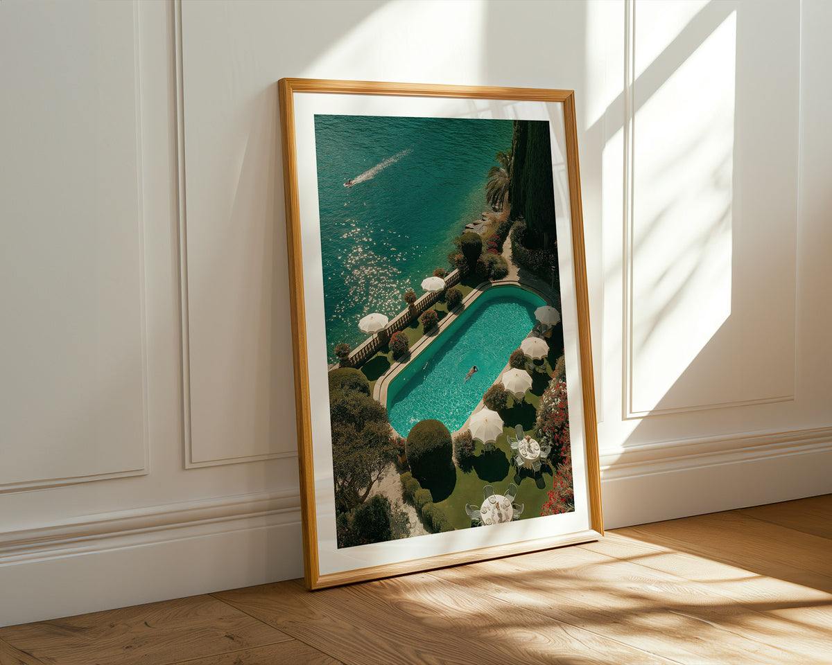 Riviera Pool Villa captures the essence of Mediterranean elegance and sun-soaked leisure. This captivating artwork showcases a private villa perched beside turquoise waters, with a glistening swimming pool framed by manicured gardens, white parasols, and blooming flowers. A lone swimmer glides gracefully through the water, while a speedboat traces sunlight across the calm sea—an image that perfectly embodies the spirit of the Riviera: relaxed, refined, and endlessly luxurious.