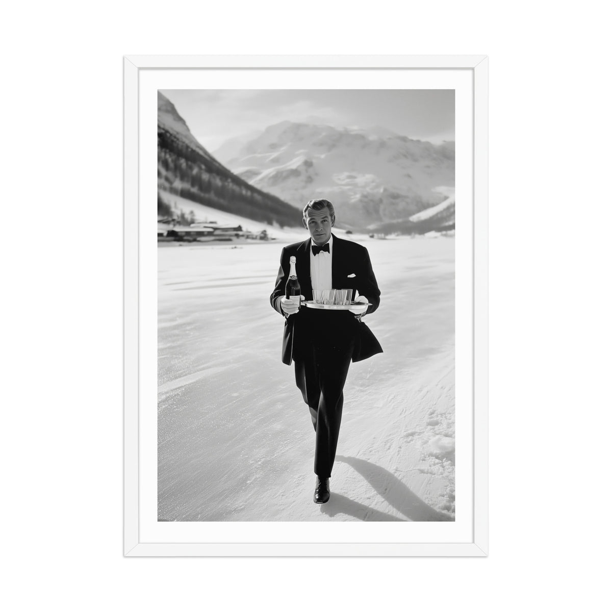 Add a touch of timeless sophistication to your walls with the Waiter in Gstaad poster. This striking black and white artwork captures the elegance of a tuxedo-clad waiter walking confidently across a snowy alpine landscape, carrying a tray with champagne and glasses. Set against the dramatic backdrop of the Swiss mountains, the scene reflects both the glamour and exclusivity of Gstaad—one of the world’s most renowned luxury destinations.