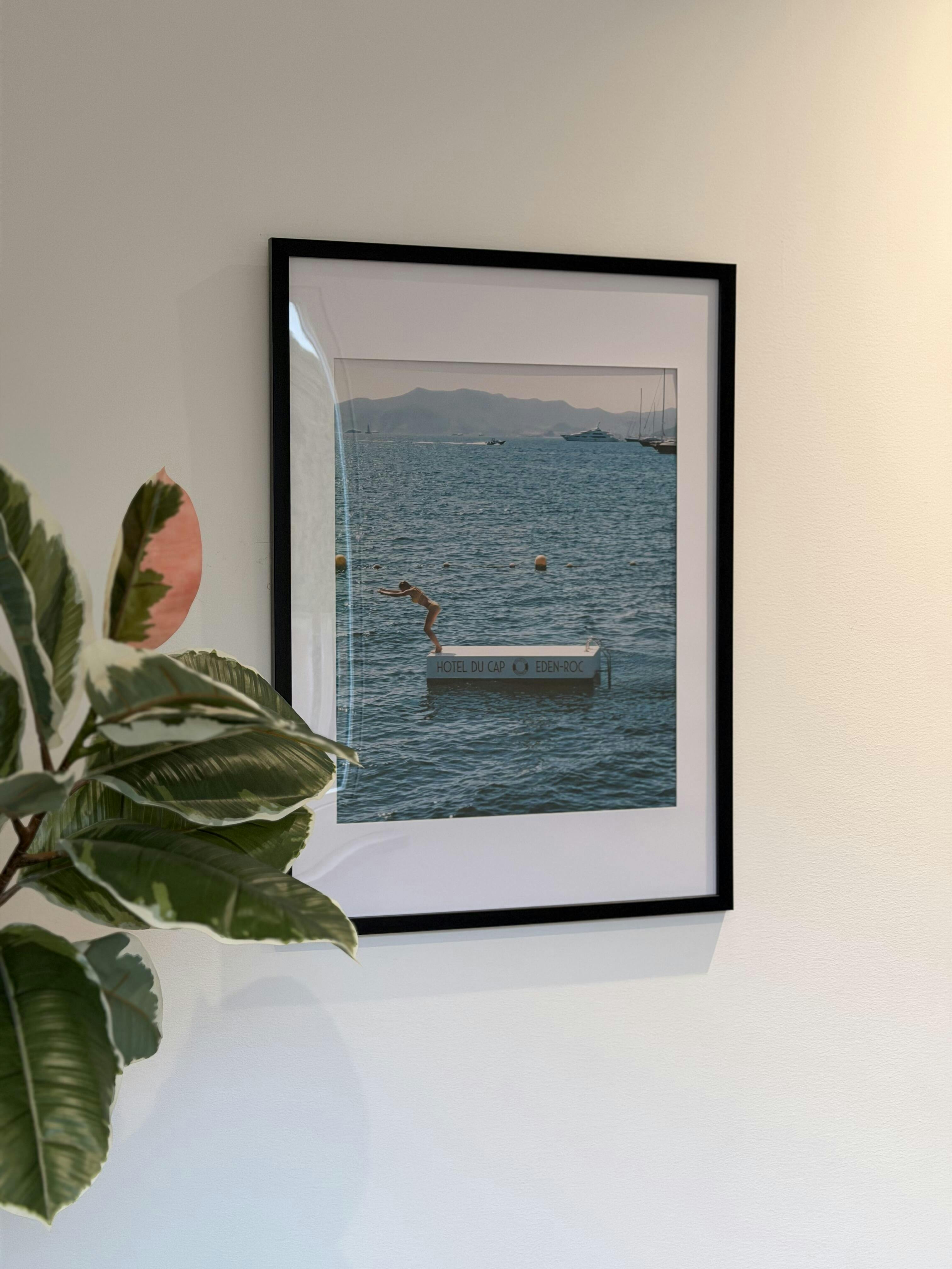 Nice poster of the iconic floating swimming platform outside of Eden-Rocs beach in Antibes. Good quality and nice.