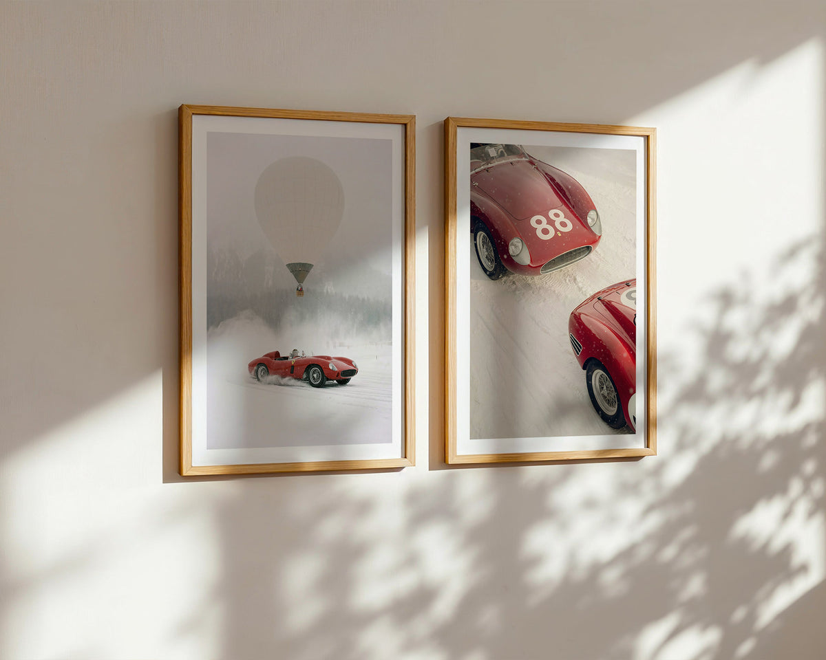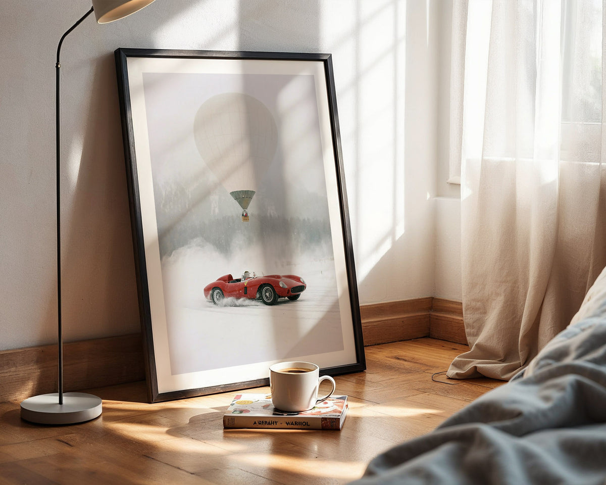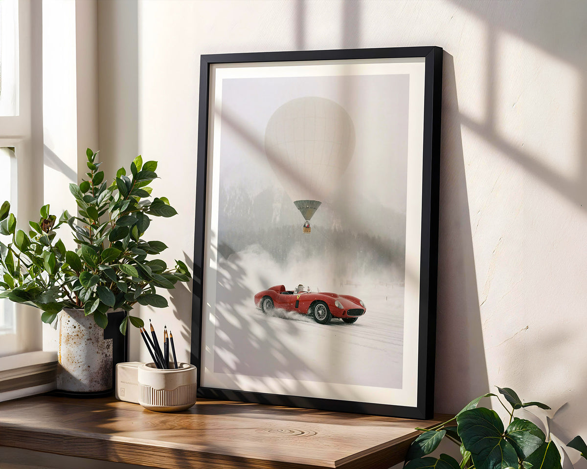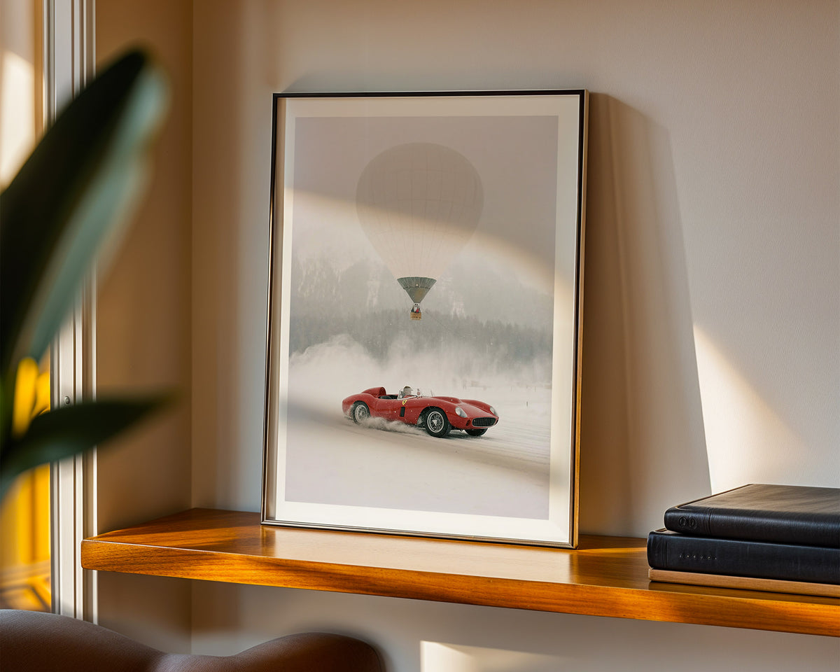 Subtle film grain and muted winter tones give the artwork an archival, cinematic feel—an homage to an era when performance, design, and adventure were inseparable. Printed on museum-grade paper, this piece is created for collectors drawn to vintage Ferrari history, Alpine travel, and timeless automotive design.