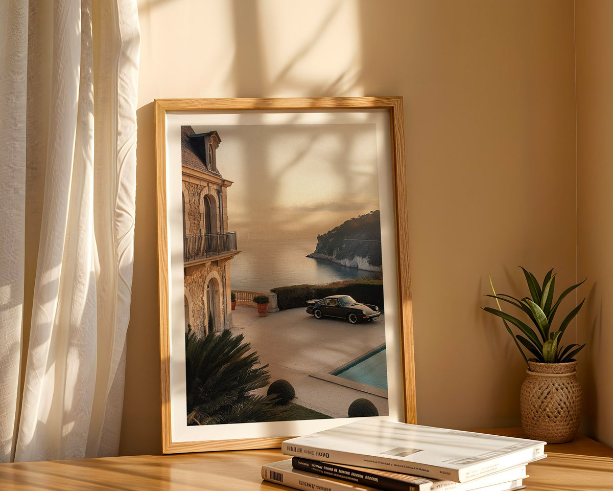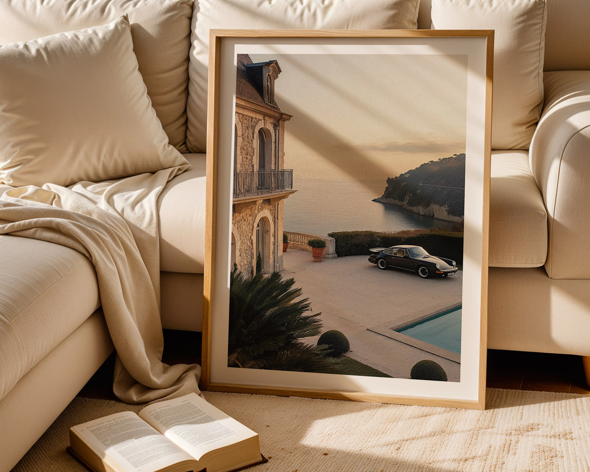 Porsche 911 Riviera Sunset Poster captures that unmistakable magic of late afternoon on the French coastline — when the light turns golden, the sea softens to glass, and time seems to slow down. A classic Porsche 911 rests in the courtyard of a cliffside villa, its silhouette glowing against the warm Mediterranean horizon.