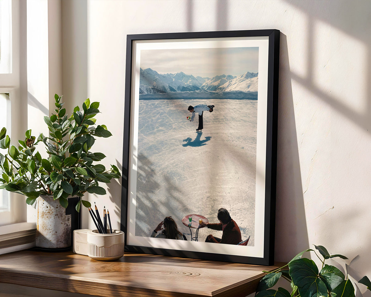 On a frozen plateau above Gstaad, a waiter glides across the ice with the precision of a seasoned figure skater, effortlessly balancing a tray of vibrant drinks as if it were the most natural thing in the world. Below him, guests sip their cocktails beneath the glowing Alps, watching this almost surreal performance unfold like a scene from an old European winter film.