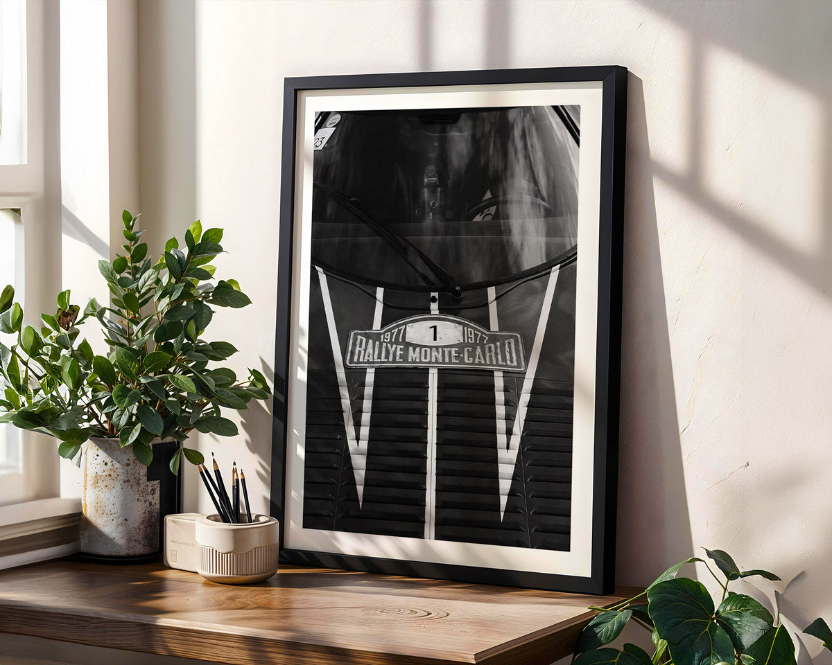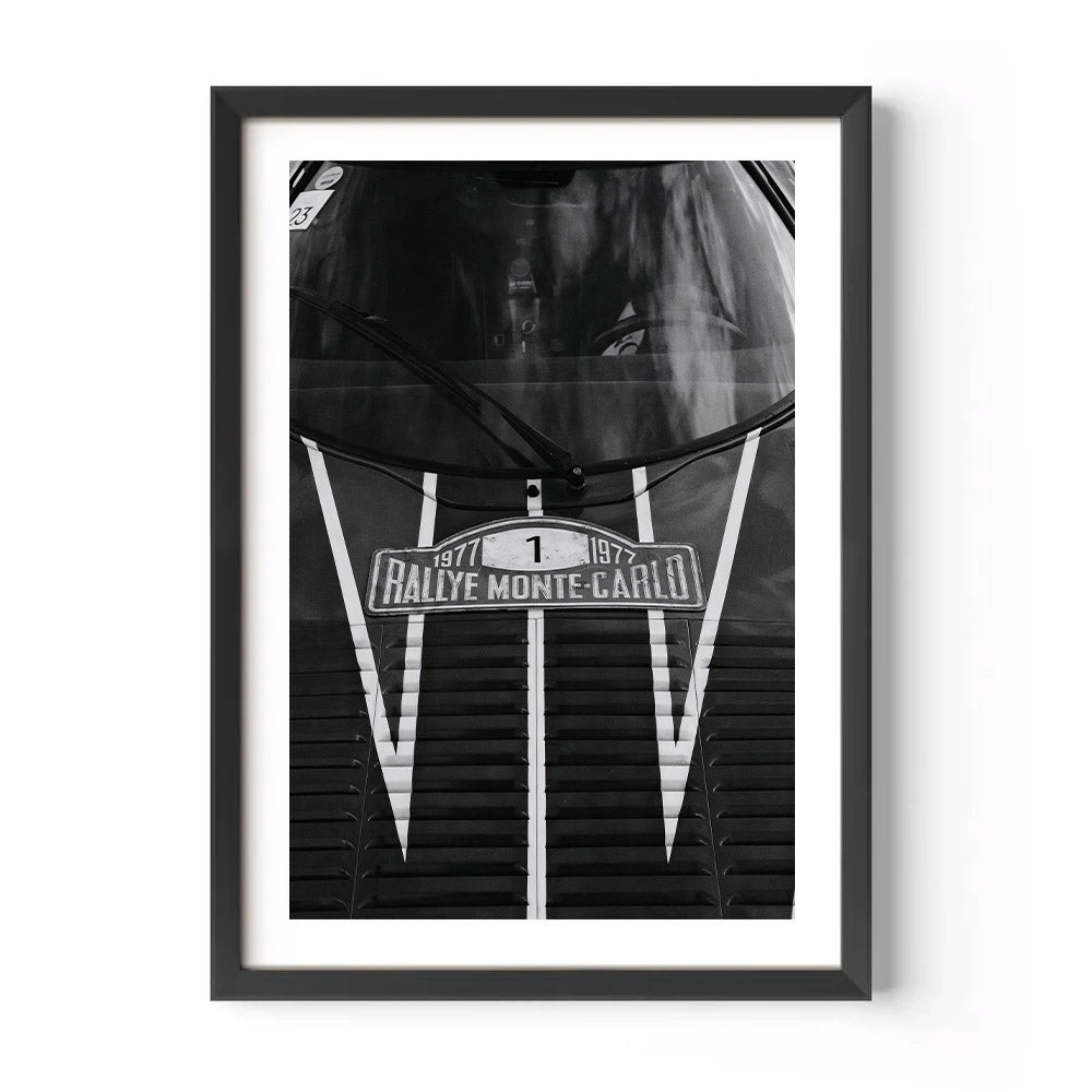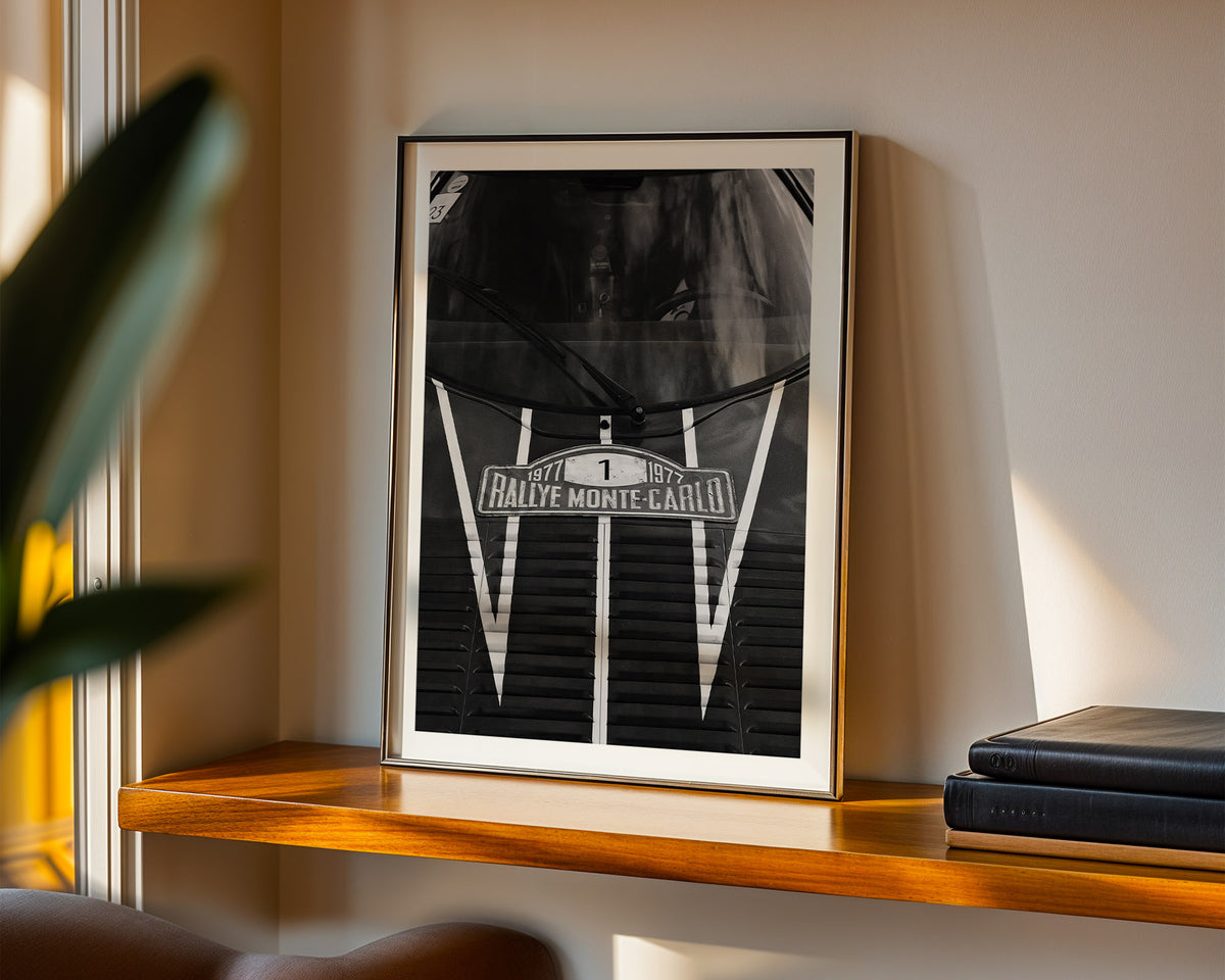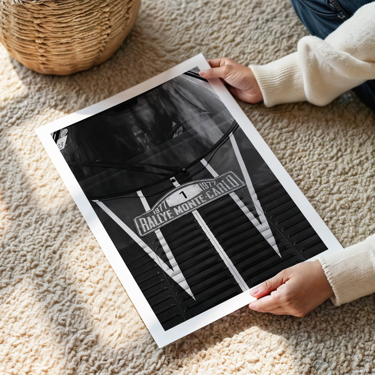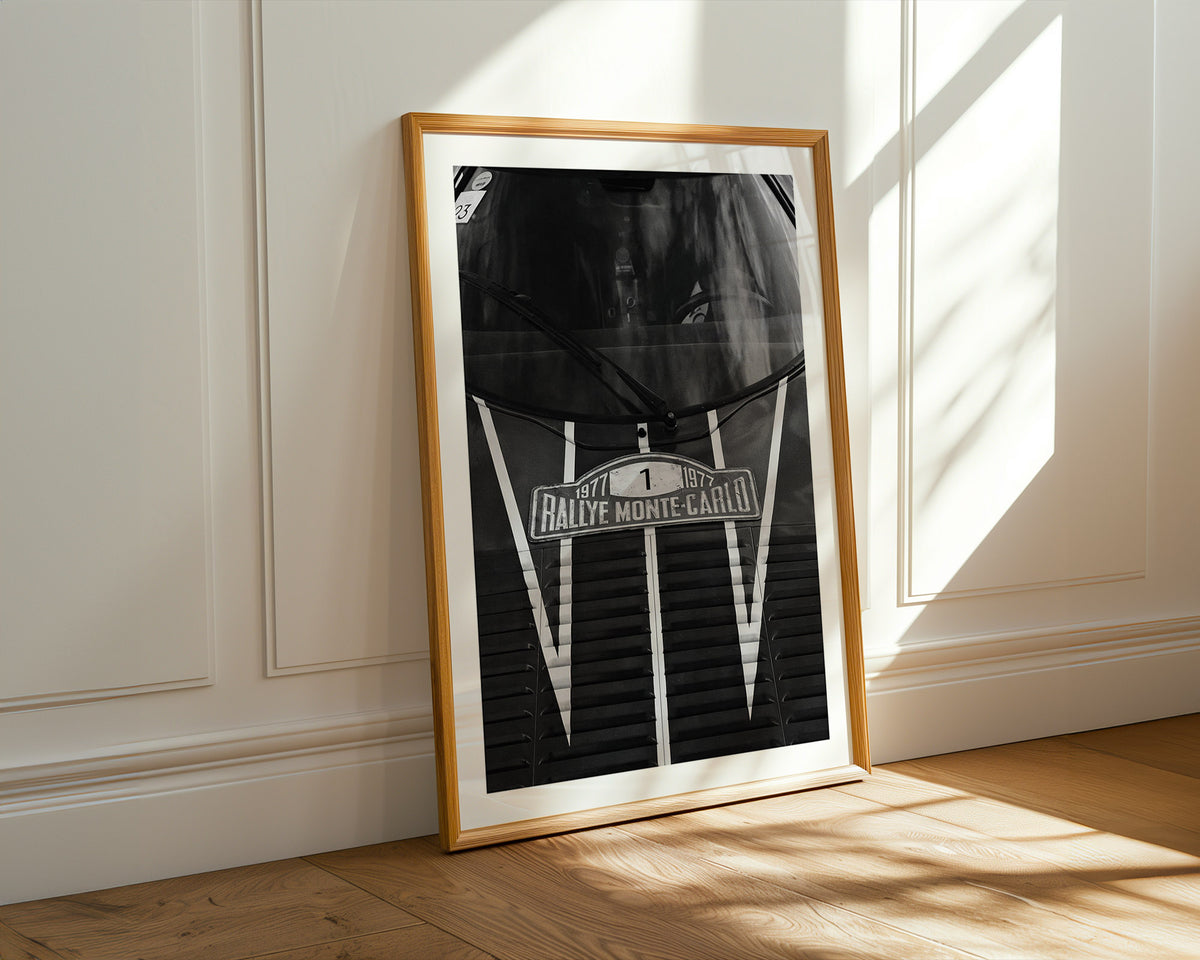 Monte Carlo Rally 1977 captures the raw spirit of classic rally racing. The close-up composition highlights the front of a vintage rally car, marked with the iconic Rallye Monte-Carlo plate. Black, white and chrome details create a graphic, timeless aesthetic that feels both powerful and elegant.