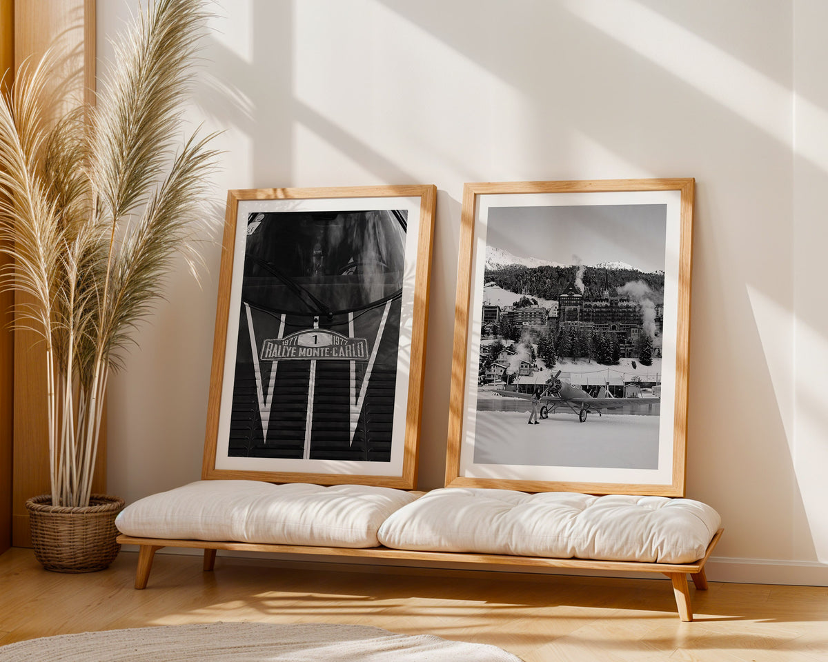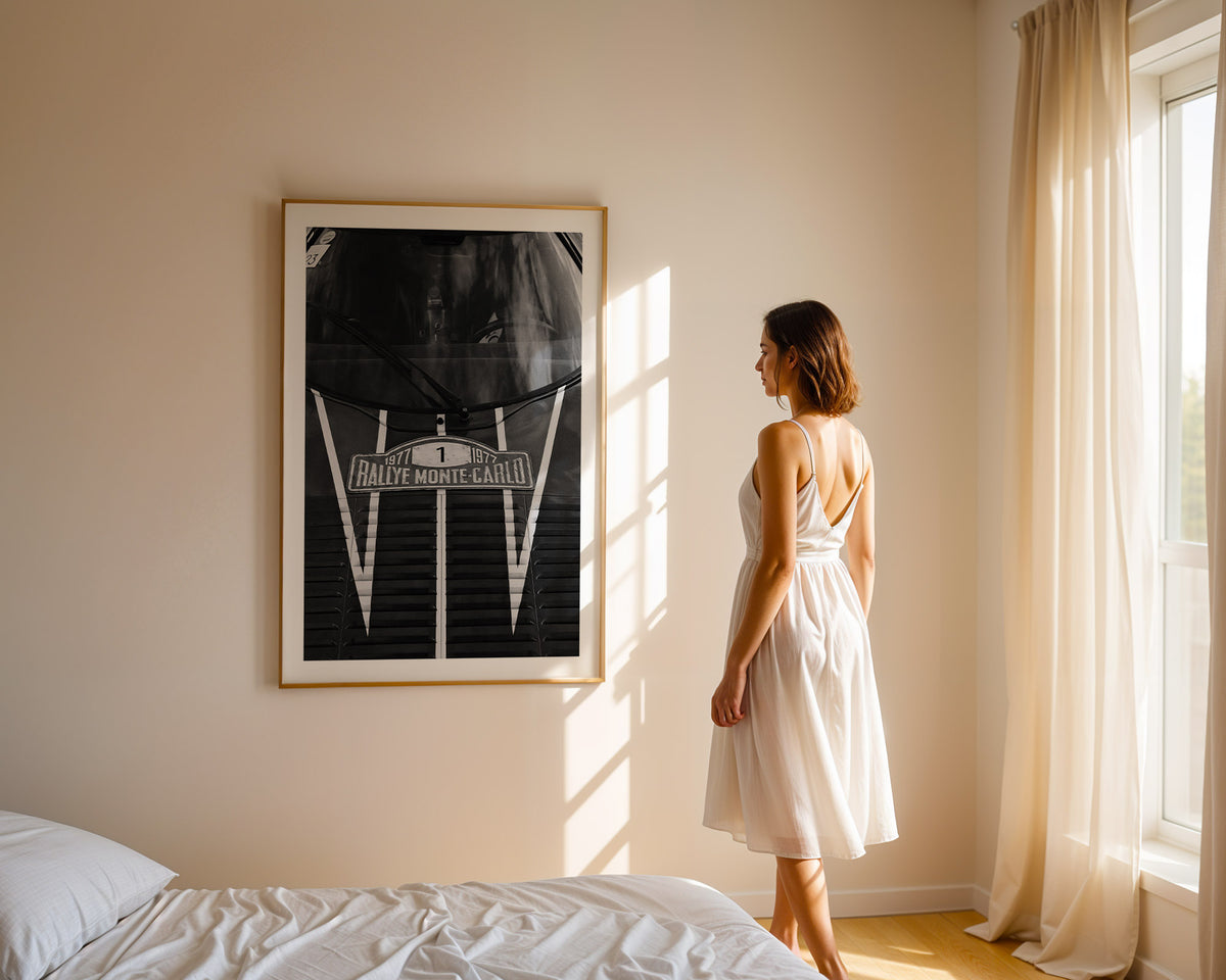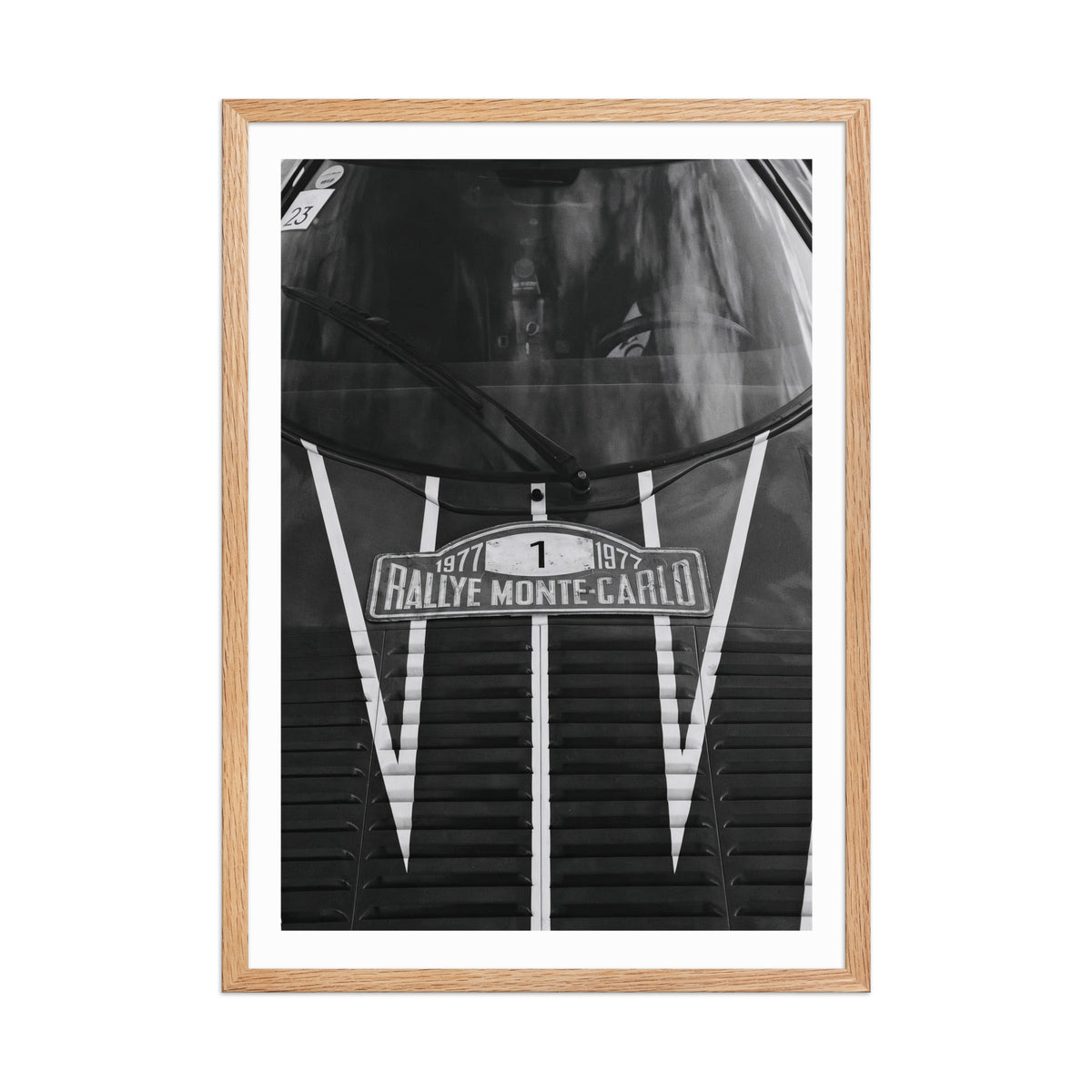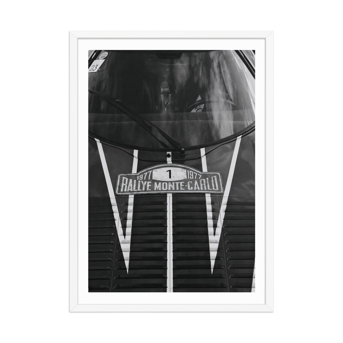 Monte Carlo Rally 1977 captures the raw spirit of classic rally racing. The close-up composition highlights the front of a vintage rally car, marked with the iconic Rallye Monte-Carlo plate. Black, white and chrome details create a graphic, timeless aesthetic that feels both powerful and elegant.