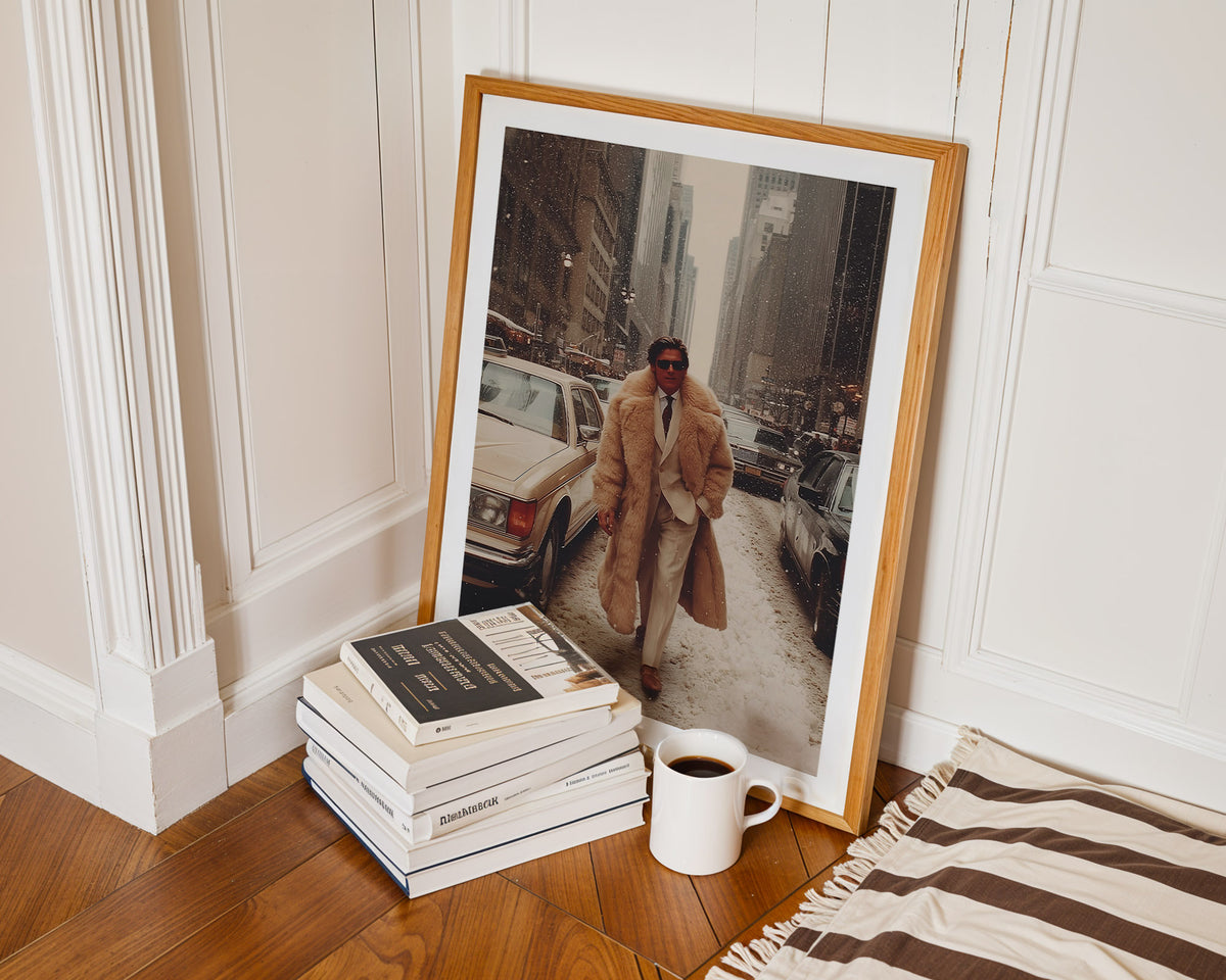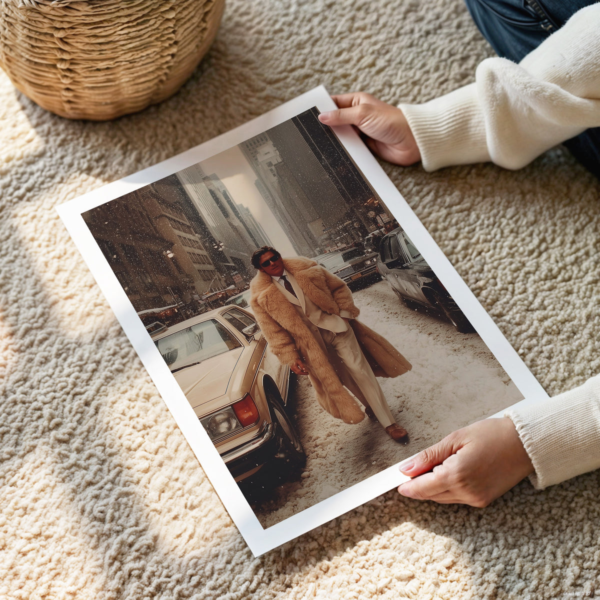 New York Power and Poise captures the pulse of Manhattan in its purest form — ambition wrapped in style, confidence framed by snow and skyscrapers. A man strides through the bustling streets of New York, dressed in an immaculate cream suit and a statement fur coat, embodying the essence of 1980s Wall Street power. The snowfall softens the city’s relentless rhythm, yet his presence cuts through it with quiet authority — the look of someone who owns both his time and his destiny.