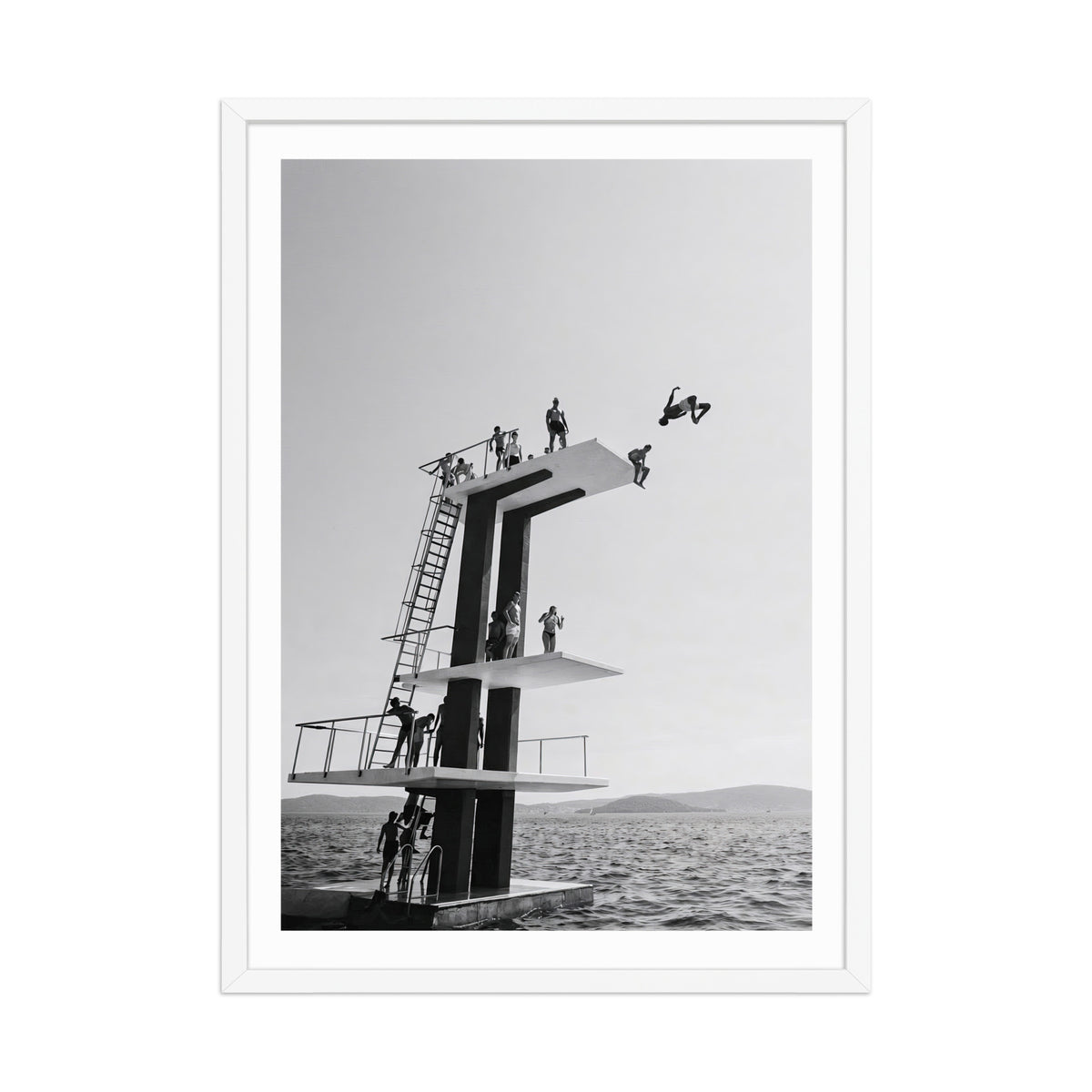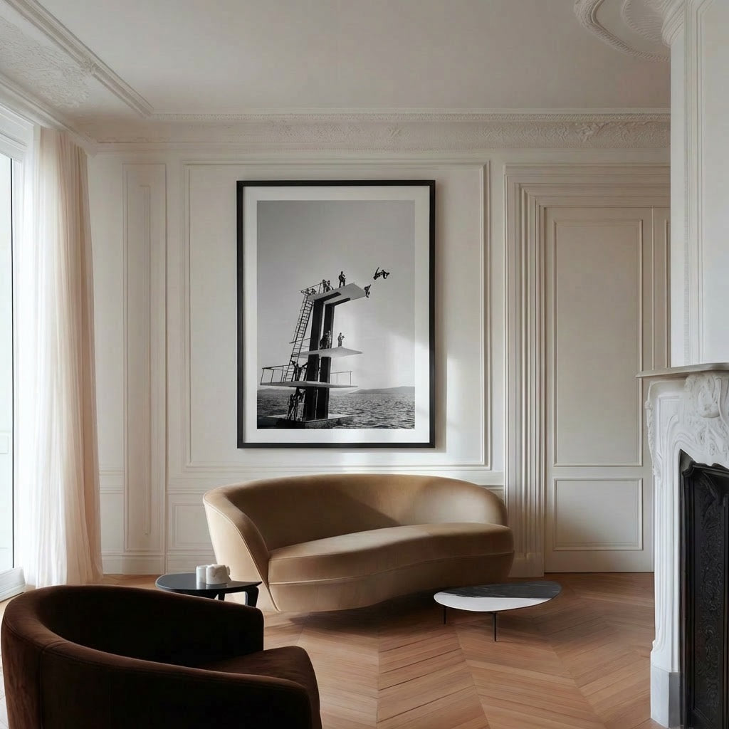 A classic diving tower rises above the Mediterranean as bodies freeze mid-air — elegant, fearless, perfectly composed. This piece blends 1960s coastal leisure with architectural minimalism, evoking endless summers, salt in the air, and the ritual of jumping without hesitation.