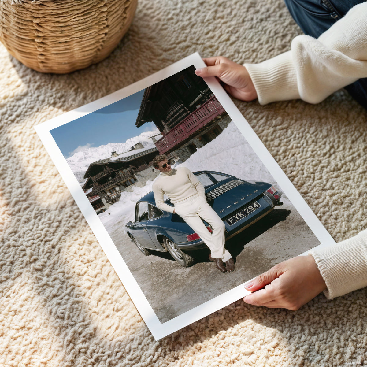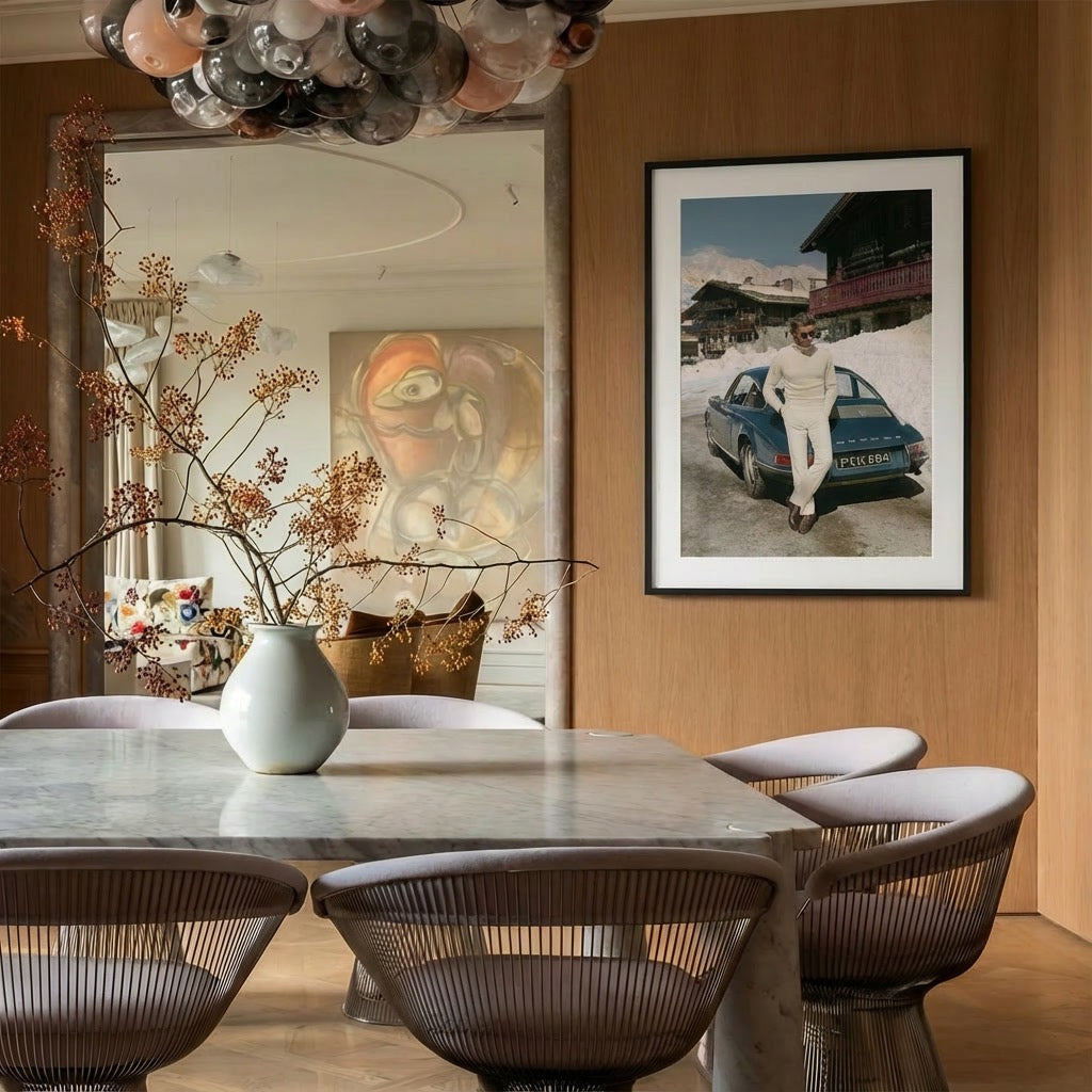 Traditional wooden chalets frame the backdrop, while the crisp sun reflects off untouched snow, creating that unmistakable St. Moritz glow. Every detail — from the polished leather boots to the iconic silhouette of the early 911 — captures a world where style is effortless and elegance is inherited, not announced.